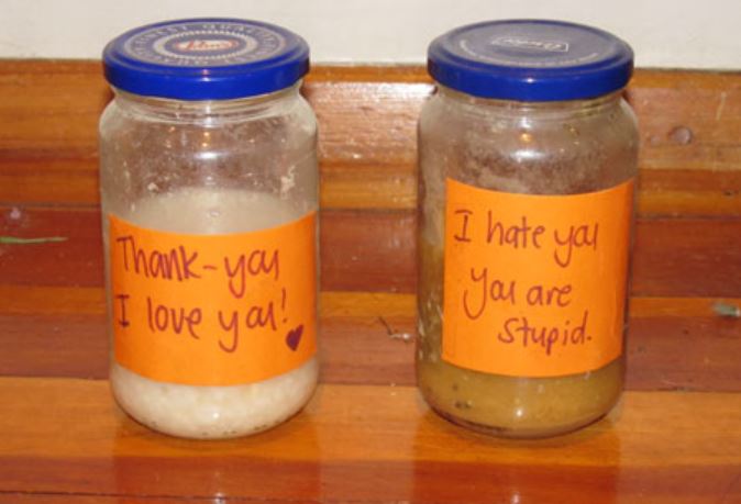 De bekertjes werden in de keuken geplaatst onder exact dezelfde omstandigheden. Voor een periode van 2 weken moesten ze lieve woordjes zeggen tegen het ene bekertje en lelijke woordjes tegen het andere. Tegen het ene bekertje woordjes als: wat zijn jullie mooi, wat groei je goed, ik hou van jullie, jullie zijn prachtig enzovoort. Tegen het andere bekertje woorden als: wat zijn jullie lelijk, gatver ik haat jullie, wat stom zijn jullie ☹.